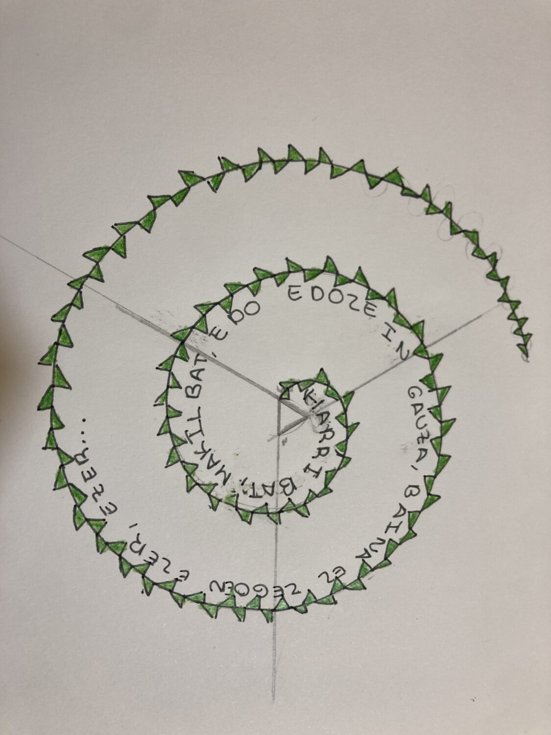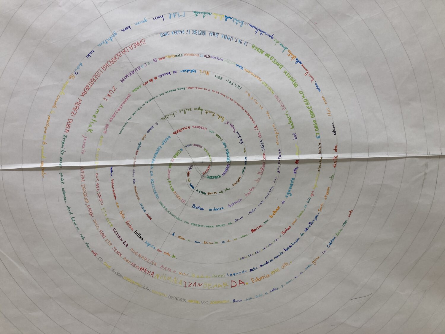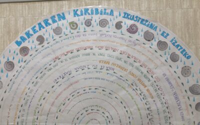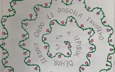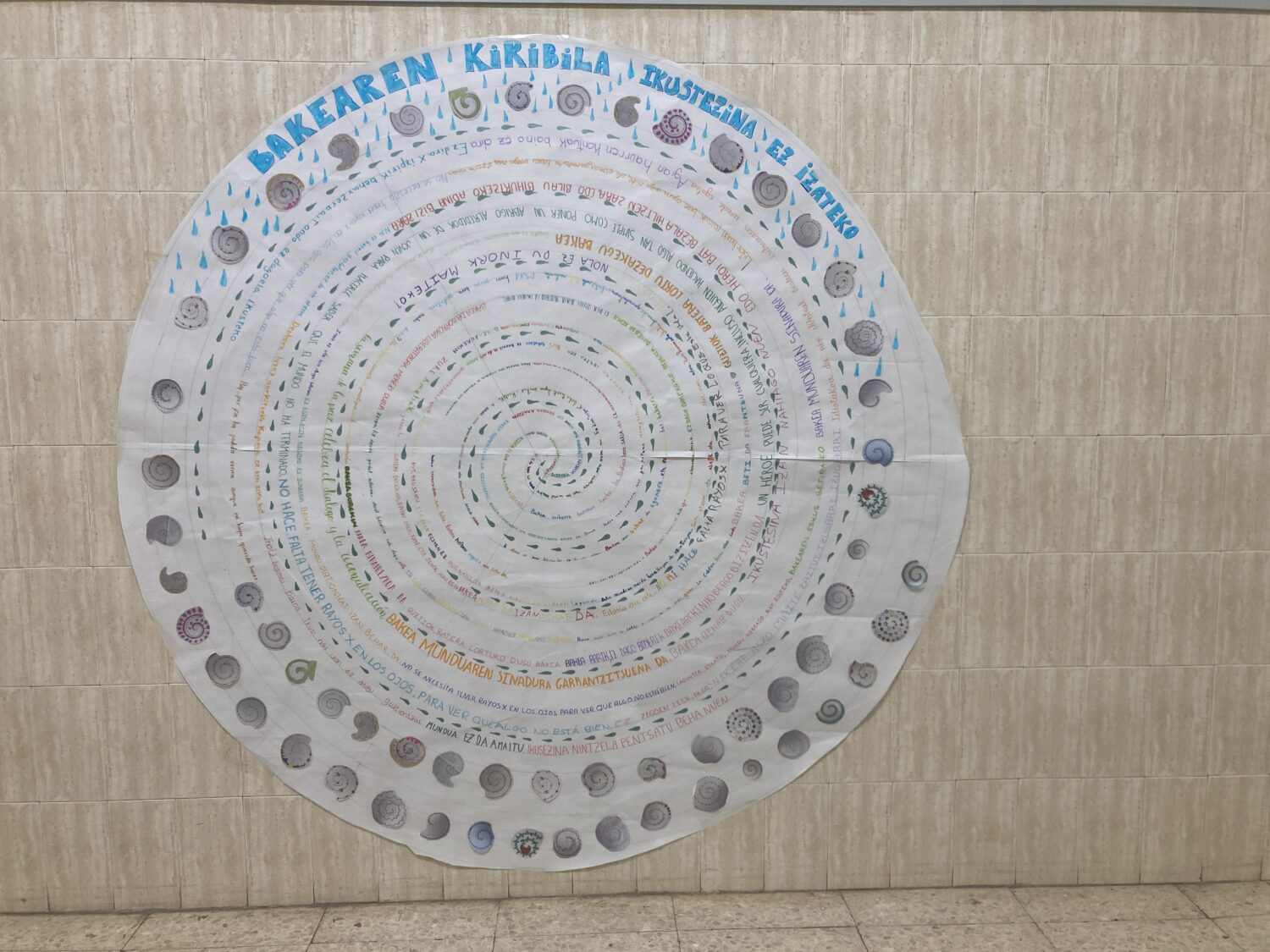 Beste urte batez, «Bakearen Espirala» egin dugu, DBHko 2. mailako plastika ikasgaian espiralak egiten ikasi ondoren. Oraingoan, Eloy Morenoren Invisible liburuko ikasleen esaldirik hunkigarrienak idatzi dituzte. Bakearen astean zehar liburua klasean irakurri ondoren egiten dugun jardueretako bat da hau.