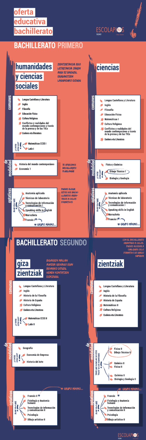• Oferta de Bachillerato: las modalidades de Bachillerato, itinerarios y materias optativas que se cursan en nuestro colegio.