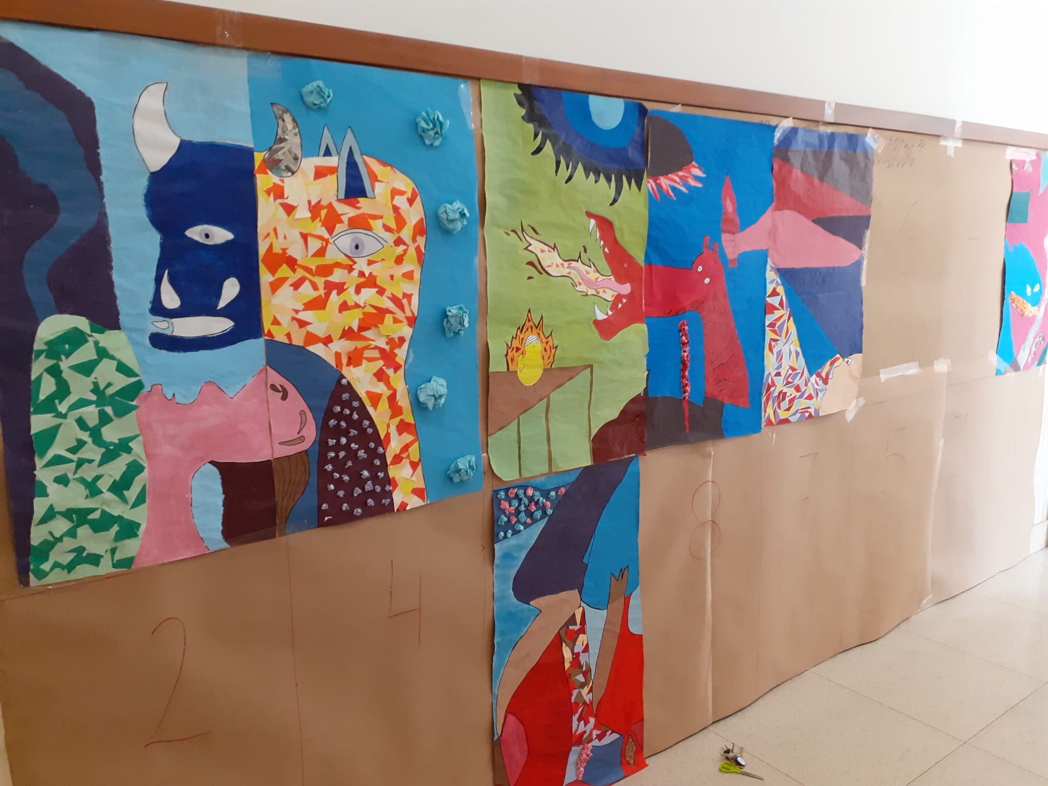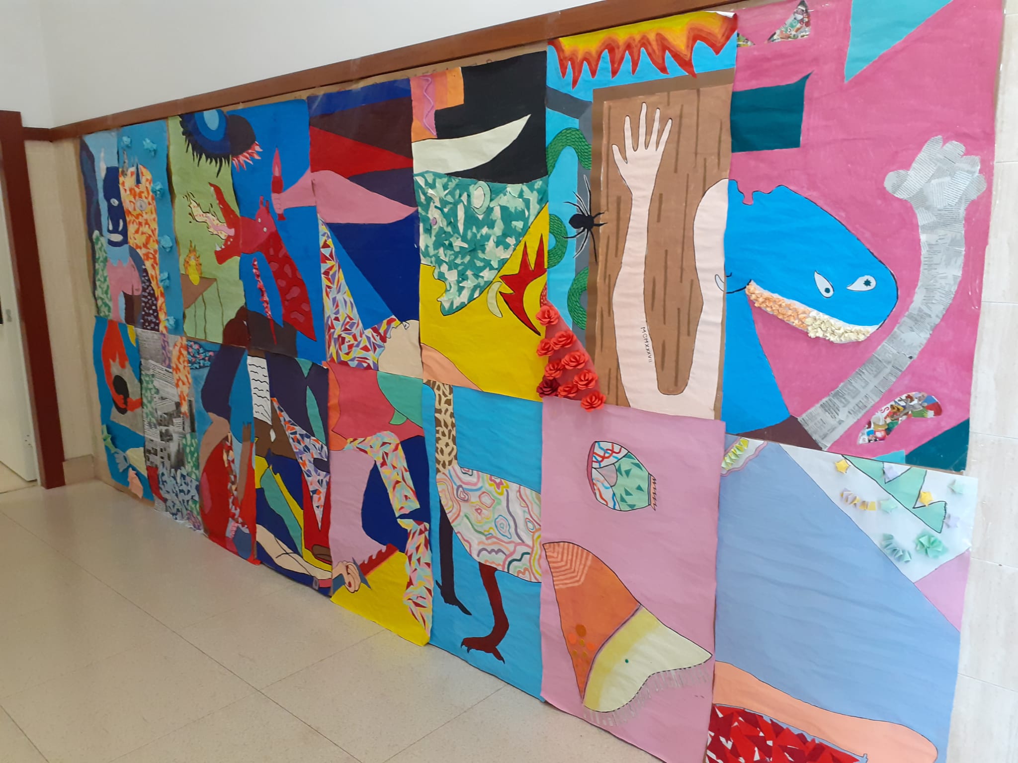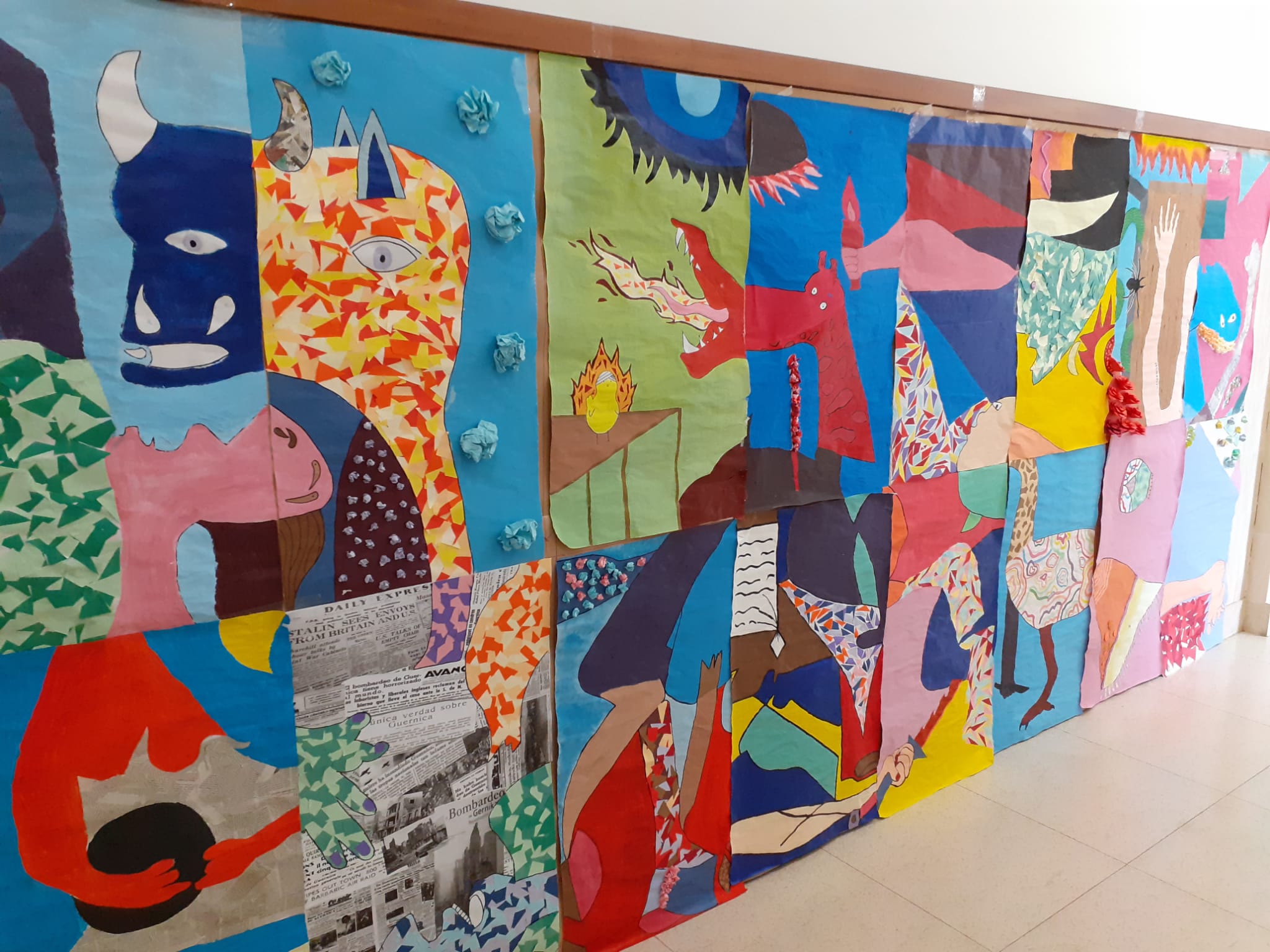 Versión del Guernica de Picasso realizada por el alumnado de 1º de Bachiller en la asignatura de Dibujo artístico. Una obra realizada en 16 paneles que completa una superficie 4,5×2 metros. Bonito trabajo, a todo color, versionando la obra de Picasso.
